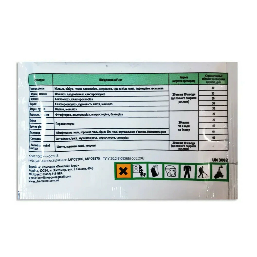 Фунгіцид здатний ефективно пригнічувати розвиток широкого переліку збудників грибкових захворювань. |